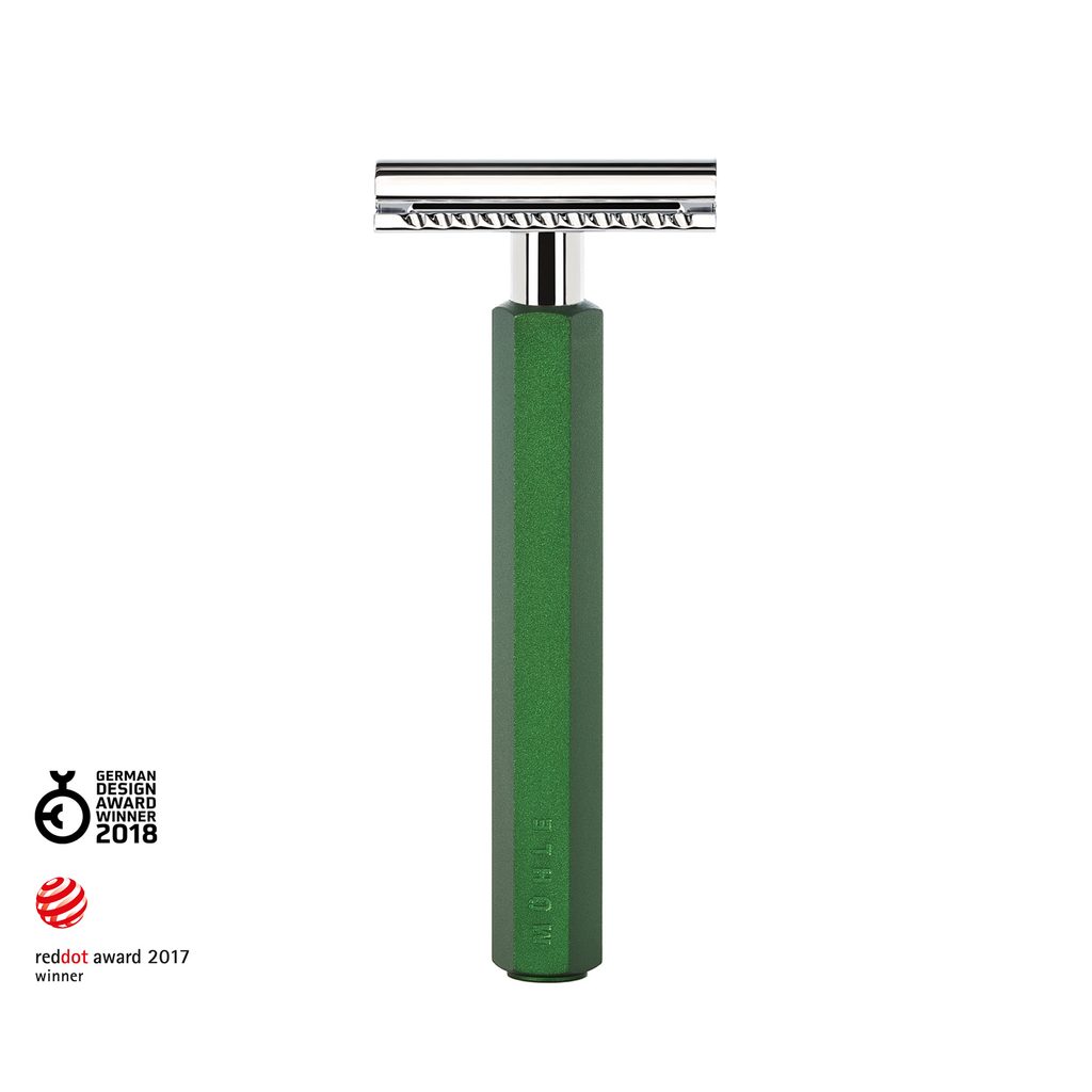 Aparat pentru bărbierit din atelierul firmei nemțești Mühle. Pentru producția acestui aparat, cei de la Mühle și-au unit forțele cu bine cunoscutul designer berlinez Mark Braun. Rezultatul este un mâner ergonomic fără precedent, hexagonal, din aluminiu anodizat de culoare verde pădure. Aparatul are capătul închis, deci va ierta chiar și mâna nesigură a începătorilor.