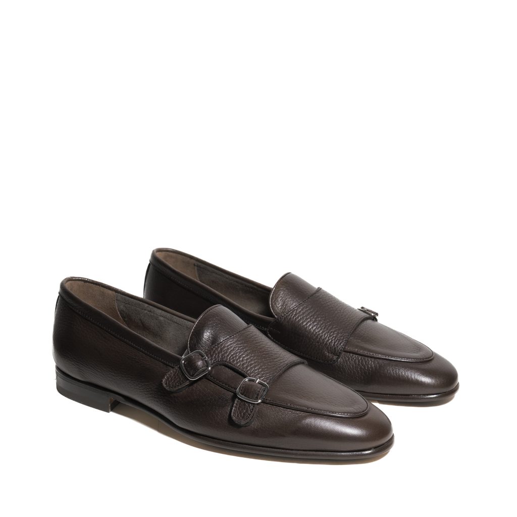 Deși nu au clasica fundiță specifică, putem spune cu deplină încredere că este vorba despre mocasini în stil belgian. Au o siluetă foarte suplă (rămân însă suficient de lați și se mulează foarte rapid pe picior), iar în locul fundiței belgiene regăsim o dublă cataramă decorativă peste rist. Partea superioară este realizată din piele granulată, care, prin sobrietatea nuanței de maro închis, echilibrează caracterul ludic al modelului. Talpa este realizată din piele, în combinație cu cauciuc Vibram.