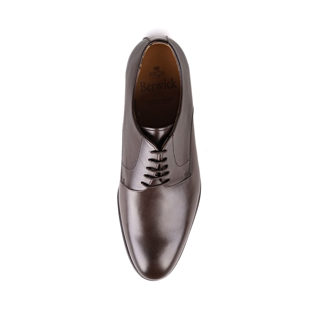 Pantofi derby cu ramă și șireturi deschise, într-o nuanță elegantă de maro închis. O variantă mai puțin formală a pantofilor clasici, pe care probabil nu îi veți alege pentru un bal, dar care se potrivesc excelent în multe alte contexte – chiar și purtați cu jeanși.