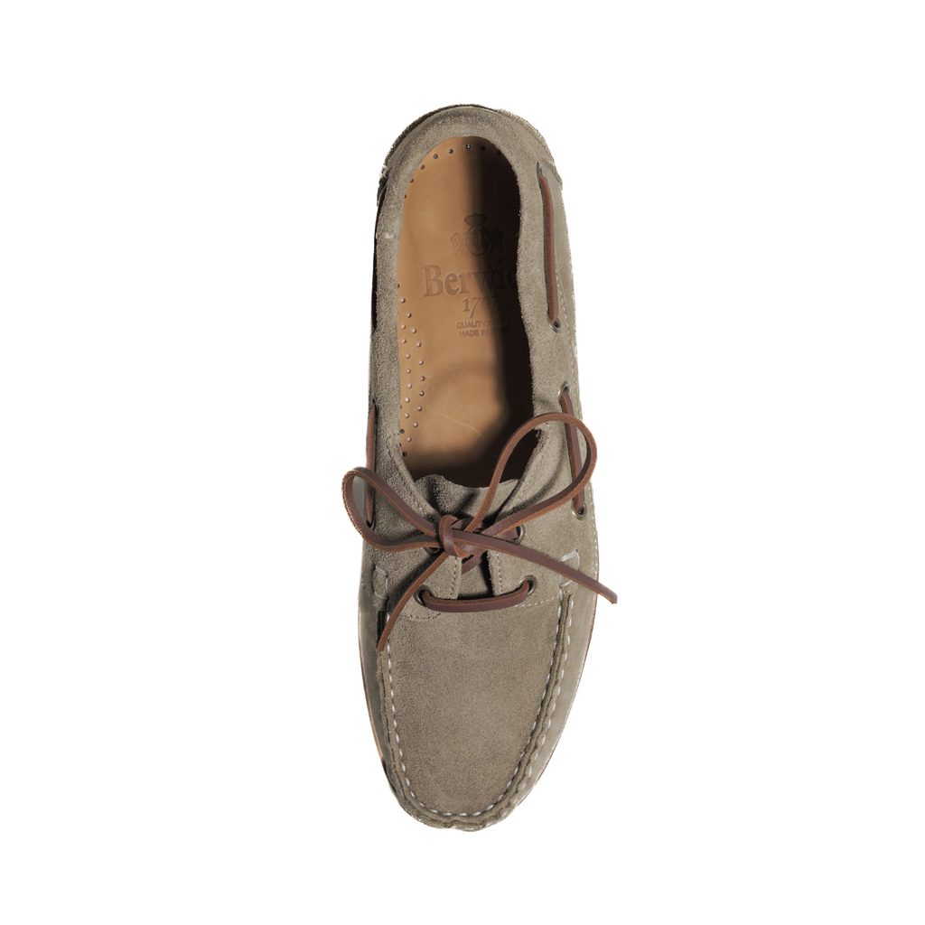 Boat shoes de la brandul spaniol Berwick, realizate din kudu reverse suede – piele întoarsă provenită de la antilopa africană kudu, prelucrată de tăbăcăria engleză C. F. Stead. Pielea întoarsă kudu este neobișnuit de moale (adesea denumită „cașmirul pielii întoarse”), fiind totodată considerabil mai rezistentă decât pielea întoarsă obișnuită, datorită fibrelor naturale dense. Încălțămintea este nepodșită, astfel încât piciorul se așază direct pe pielea întoarsă, ceea ce oferă o senzație deosebit de aerisită, mai ales în sezonul cald.