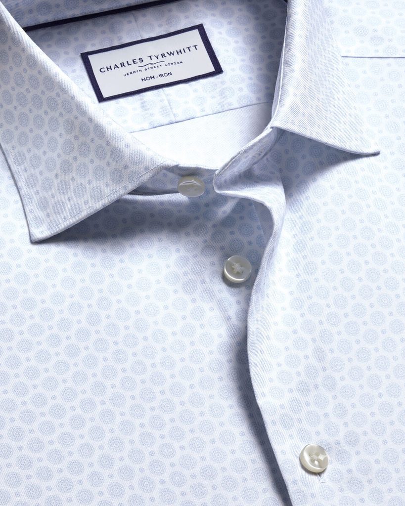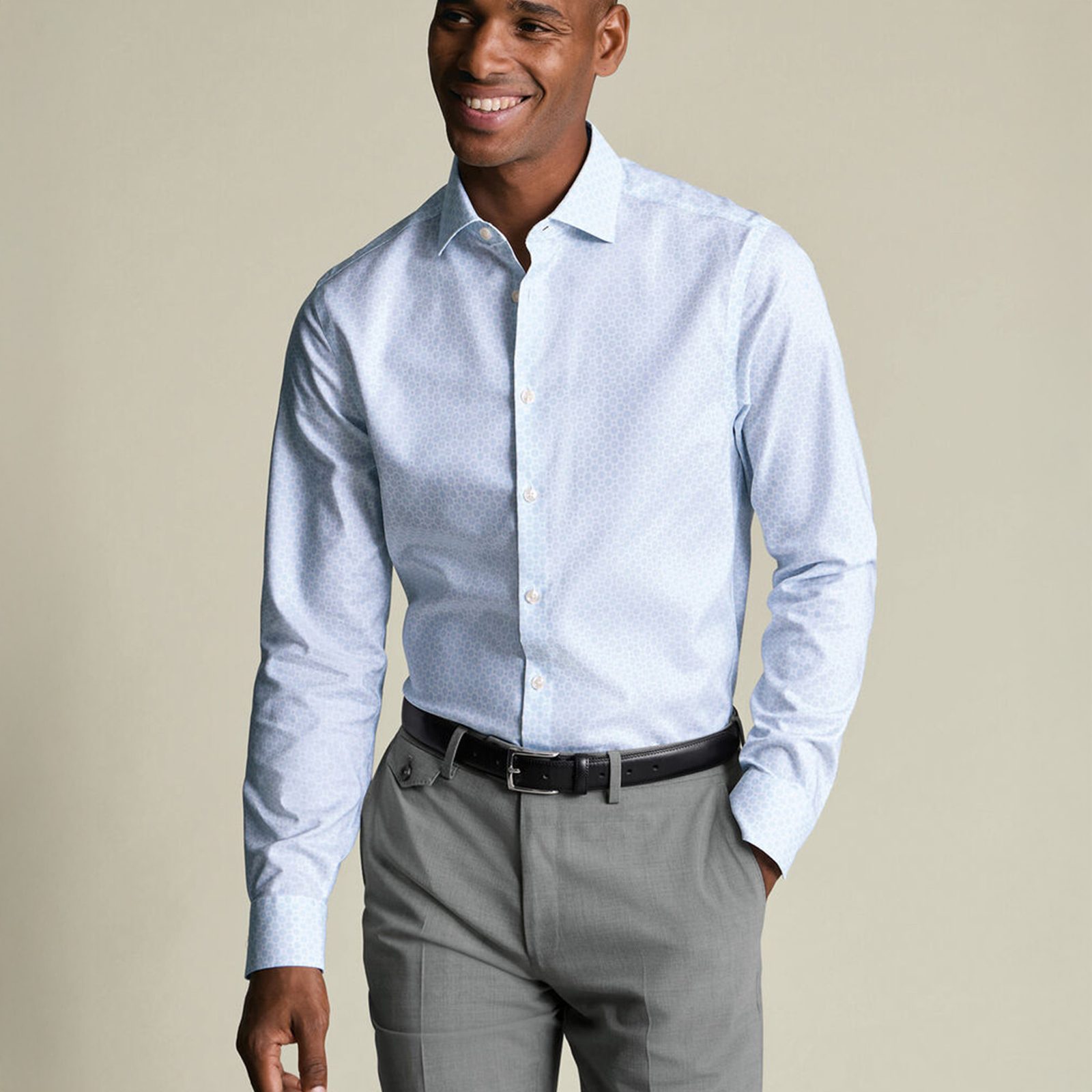 Cămașa bleu Charles Tyrwhitt, cu un model geometric subtil, oferă o notă modernă unui stil clasic. Elegantă, dar relaxată – ideală pentru zilele în care doriți să arătați îngrijit, fără a purta cravată.