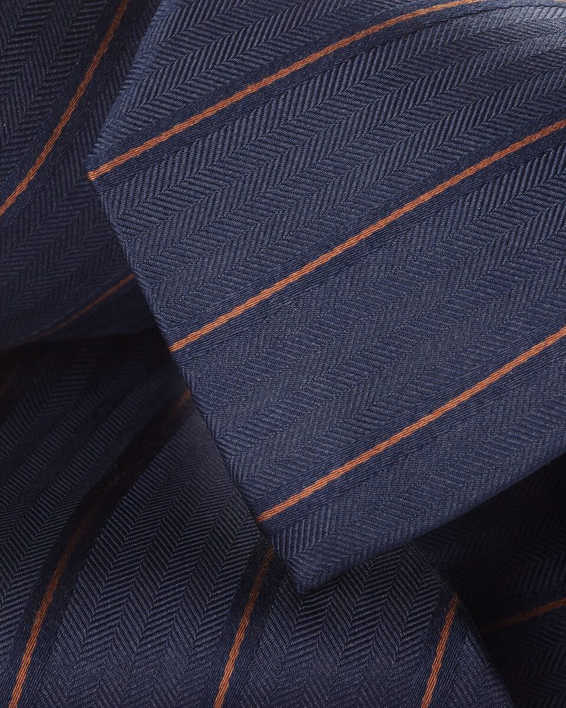 Chiar dacă modelele nu sunt neapărat pe gustul dvs. (sau preferați mai degrabă un pahar de vin ori un halbă de bere – nu judecăm), o cravată cu dungi nu ar trebui să lipsească din garderoba dvs. Ideal chiar aceasta, fiind realizată din 100% mătase și ascunzând un detaliu ingenios: o mică buclă discretă la capătul din spate, așa-numitul recovery loop. Dacă trageți ușor de ea, cravata se netezește ca prin farmec și arată ca nouă. Chiar dacă, cu o seară înainte, a ajuns – din diverse împrejurări – pe podea.