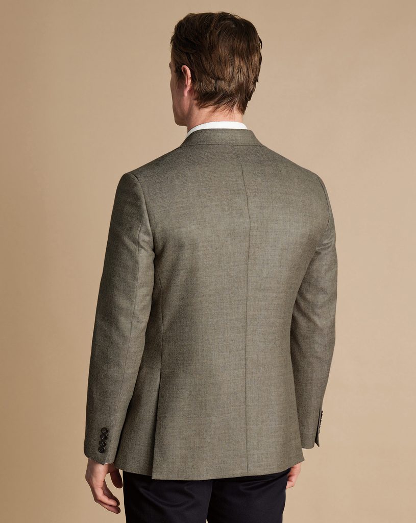 Pe scurt, este un sacou cu un croi ușor sportiv. Această notă este evidențiată de cele două șlițuri din spate (o opțiune de mijloc pe scara dintre formal și casual) și de umerii cu pernuțe mai discrete, ce oferă o siluetă naturală. Nu lipsesc nici detaliile de finețe: cusătura AMF (pick stitching) pe rever și clasica manșetă cu patru nasturi, obținuți din surse sustenabile.
