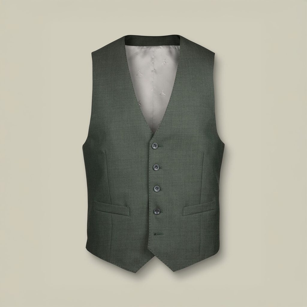 Această vestă — adesea trecută cu vederea, dar esențială pentru echilibrul unui costum — este prevăzută cu o curea de ajustare la spate, care permite reglarea facilă a circumferinței fără intervenții de croitorie. Buzunarele funcționale sunt evidențiate prin cusătură AMF, prezentă și de-a lungul părții frontale.