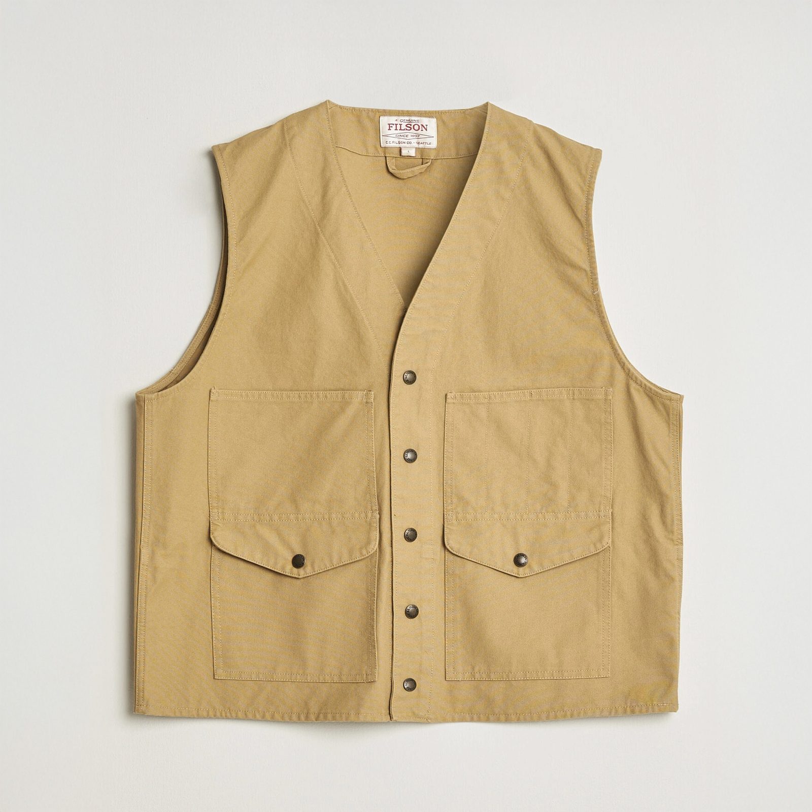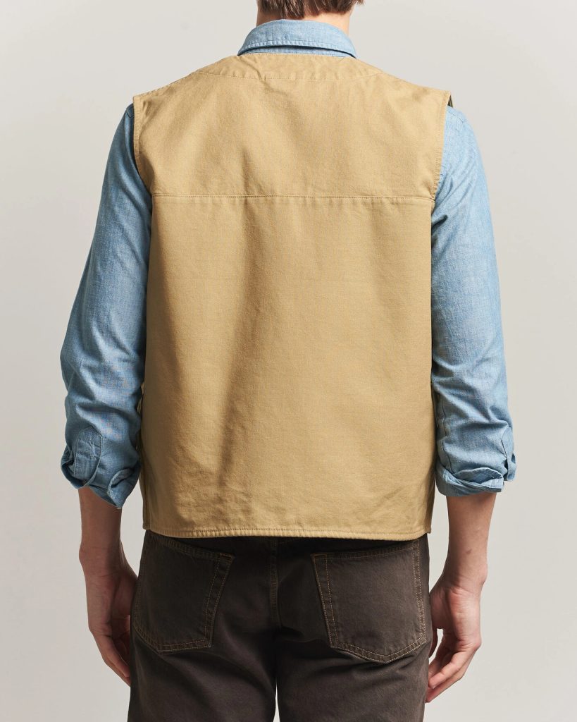 Vestă de lucru Filson, realizată din canvas din bumbac rezistent – denumirea Dry Tin face referire la textura sa uscată, în condițiile în care brandul oferă și variante ceruite. Are o croială clasică în V, fără guler, și se închide pe toată lungimea cu capse metalice, de la decolteu în jos. În față sunt două buzunare mari cu clapetă și nasture, suficient de adânci pentru a fi cu adevărat funcționale.