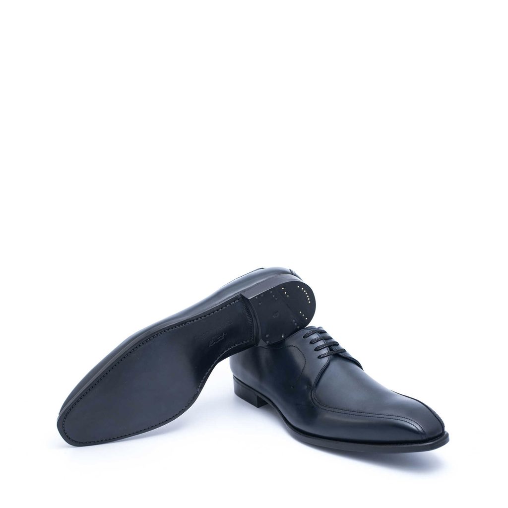 Pantofi derby mai puțin formali – adică pantofi cu șireturi deschise – cu o cusătură elegantă de-a lungul îndoirii de la înălțimea piciorului. Datorită designului atent, în special a înălțimii mari și a părții mai late din zona degetului mic, sunt extrem de confortabili. Sunt fabricați doar din piele franțuzească de cea mai bună calitate, aici în culoarea „tan” deschisă.