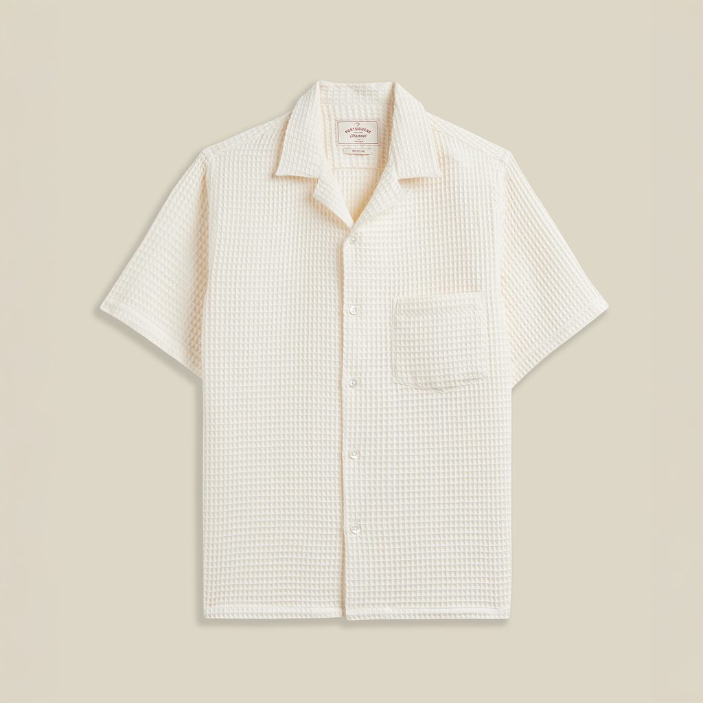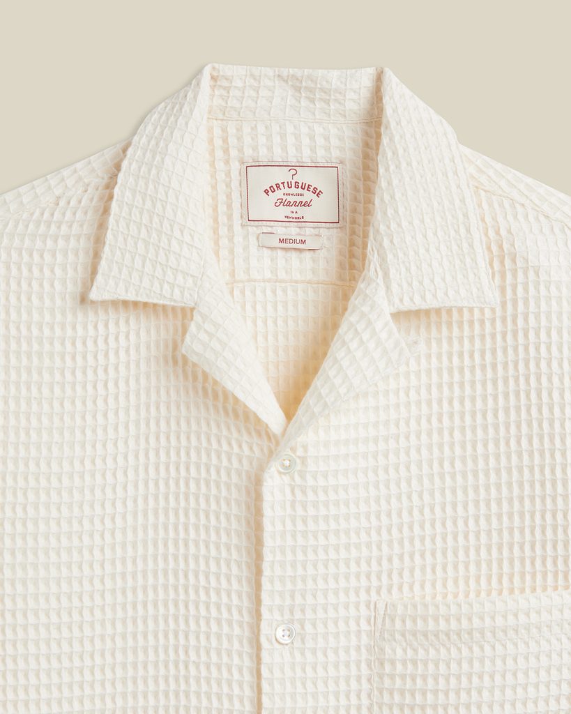 Cămașă de vară ușoară, cu mânecă scurtă, construită pe simplitate, pe structura materialului și pe o croială curată. Țesătura texturată conferă întregii piese caracter, rămânând în același timp plăcută la purtare chiar și în zilele mai calde. Gulerul deschis (camp collar) are un aer relaxat, astfel că această cămașă funcționează la fel de bine purtată ca atare, cât și descheiată peste un tricou.