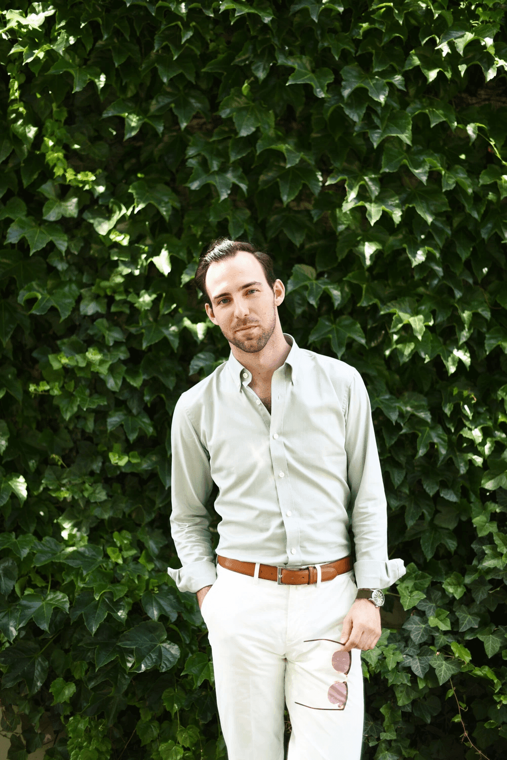 Chinos albi SuitSupply | Mokasine și curea Berwick | Cămașă verde cu guler button-down John & Paul | Ochelari de soare Ray-Ban | Ceas Timex Mk1