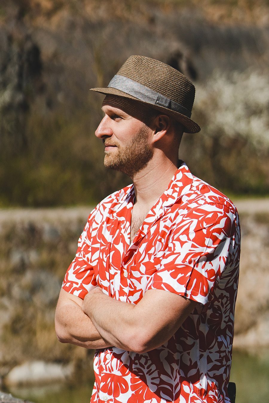Ornamentele îndrăznețe fac parte din vară.De aceea, am ales o cămașă hawaiiană din noua colecție Portuguese Flannel, pe care o puteți asorta cu o pereche de pantaloni scurți de culoare bej. Am completat ținuta cu o pălărie Trilby cu panglică gri. Acest tip de pălărie a fost popular încă din 1894, când a apărut pentru prima dată în adaptarea teatrală londoneză a romanului cu același nume de la George du Maurier.